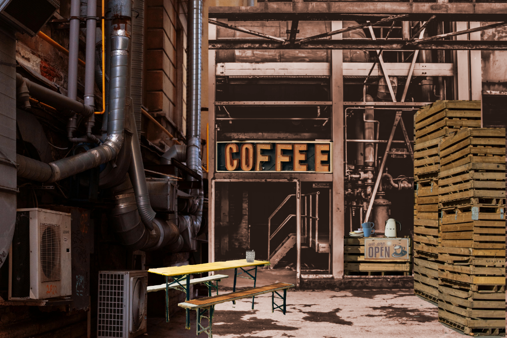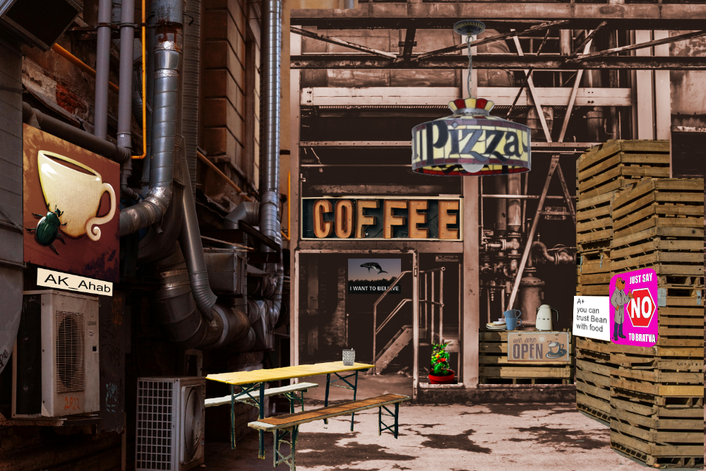 The premise was that it was a non-profit co-op set up in a corner of an abandoned factory somewhere, something somewhat unauthorized. I made a collage of art from pexels.