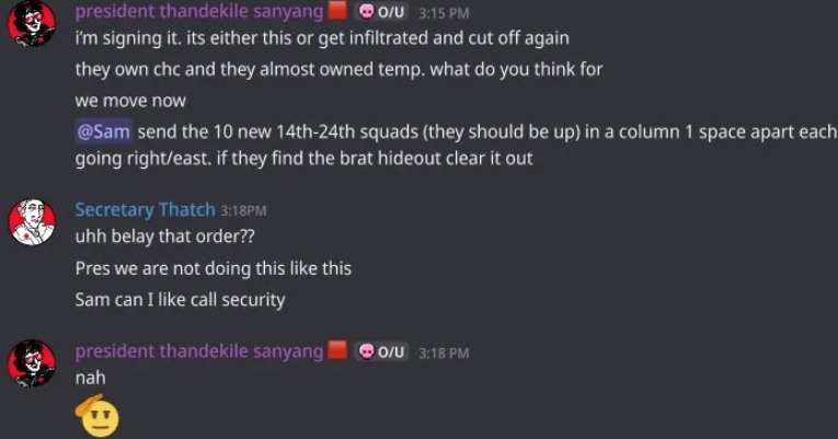 I tried to talk her down 1 on 1. After a little talking she tried to begin a sweep-and-clear for a "Bratva Boss safehouse" using the ten squads we just raised. She wanted to "lock in" the move, I tried to stop that, we both called for HQ Security, the Local 10th and Local 11th. (I took this pic before the standoff and subsequent ruling. This is a HIGHLY sensitive thread) The 10th arrived first, listened to me, she didn't stand down and... that was that.